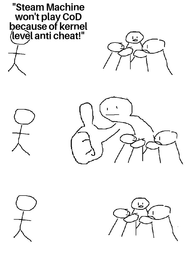 Fewer choices is a drawback, and it will limit the market share, but I think most people who would be interested in a Steam Machine probably don’t care that much about the kinds of games that utilize kernel anti cheat. Some buyers might just be displaying sour grapes, and some console CoD-like players might be looking to make the switch to PC but this is a nonstarter for them. I do truly feel bad that they won’t get a welcome mat through this path, but it’s neither their fault nor Valve’s fault.