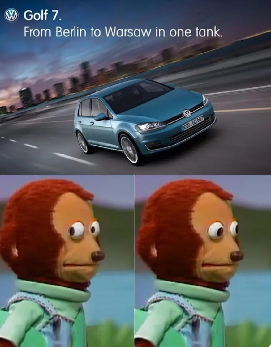 A picture of a VW car driving down a motorway with the road and background blurred. It is captioned: