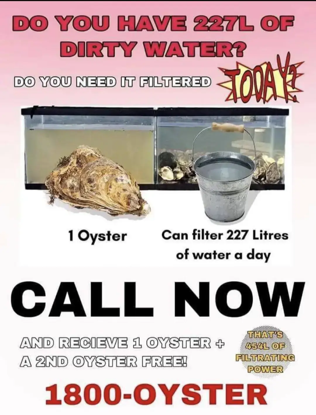 sounds like a scam! i bet if the water is too dirty the oyster is going to close and shut off the city’s water supply
