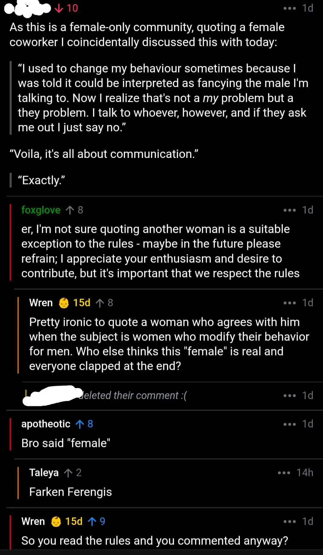 arrow-up1260arrow-down1imageDude read the rules of woman only community and decided to post anywaylemmy.dbzer0.comSchwertImStein@lemmy.dbzer0.com to Mildly Infuriating@lemmy.worldEnglish · edit-224 days agomessage-square302fedilink